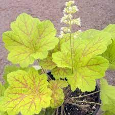 L'heuchère électra est une des variétés les plus intéressante, son feuillage jaune réhaussé par les nervures rouges illumine les endroits ombragés du jardin.